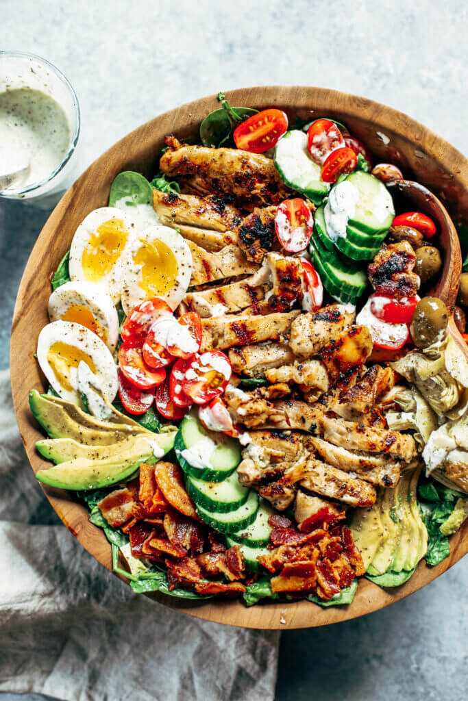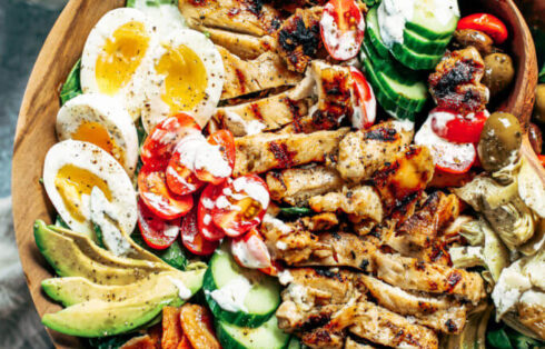 Salată cu piept de pui la grătar, avocado, măsline, roșii, castraveți, anghinare, ou și bacon crocant+sos cu iaurt, lămâie și mierelei 34.00